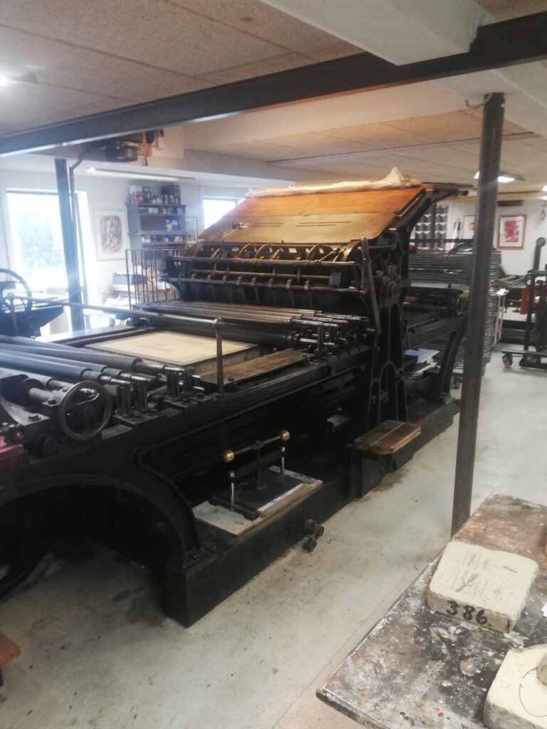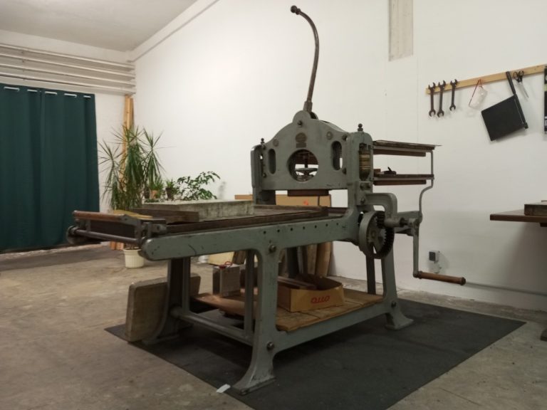 Unser Studio ist im Aufbau: Derzeit arbeiten wir mit einer Handreiberpresse von Karl Krause in Leipzig, planen jedoch bereits die nächsten Schritte. Noch in diesem Jahr erweitern wir unsere Ausstattung um eine Steindruck-Schnellpresse der Firma Albert&Co, Frankenthal; und eine Offset-Andruckpresse dr Firma Steinmesse & Stollberg.